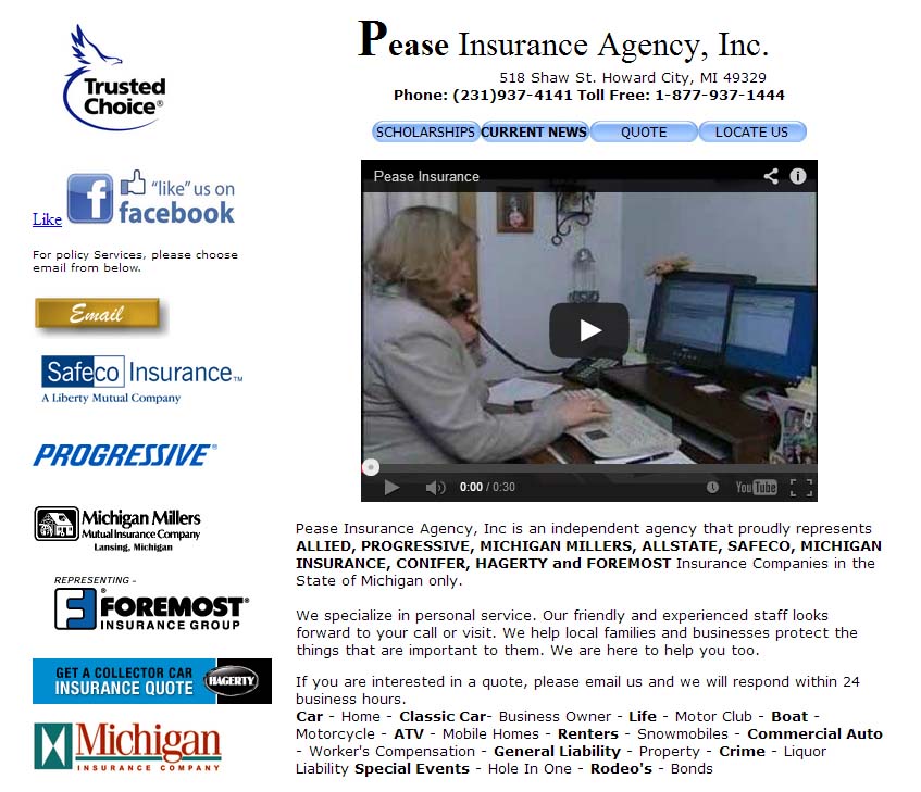 According to their website: “Pease Insurance specializes in personal service. Our friendly and experienced staff looks forward to your call or visit. Pease Insurance helps local families and businesses protect the things that are important to them. We are here to help you too.”